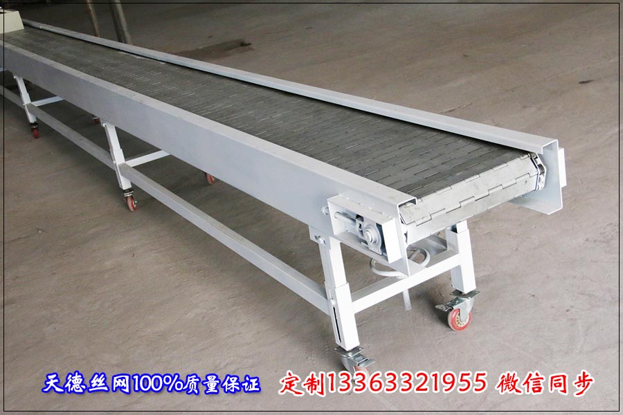 四、鏈板輸送機采用不銹鋼鏈條傳動,速度安穩,能確保的同步運送。