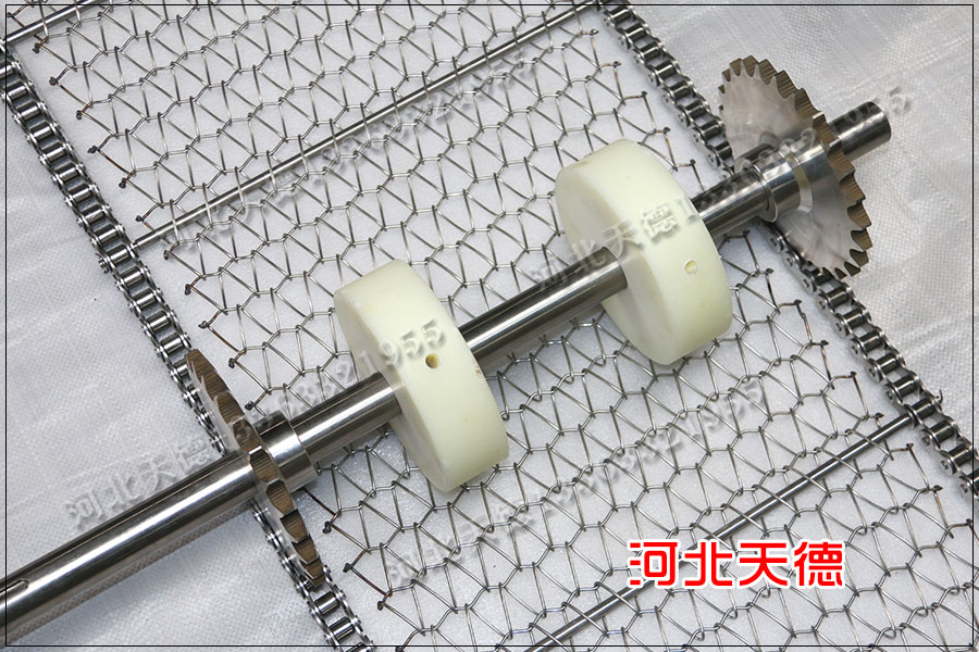 清洗輸送線上的載重非常的輕,客戶特意要求使用小滾珠金屬鏈條網帶,小滾珠鏈條節距為19.05毫米,采用鏈桿直徑為5毫米的鋼桿組裝。