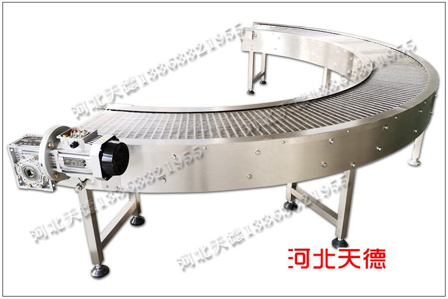 轉(zhuǎn)彎角度為180度,客戶要兩端與直線網(wǎng)帶輸送機(jī)進(jìn)行銜接組成流水線,用來輸送小箱子,整條輸送線平穩(wěn),這臺(tái)轉(zhuǎn)彎機(jī)整機(jī)采用不銹鋼304材質(zhì)的材料加工的。